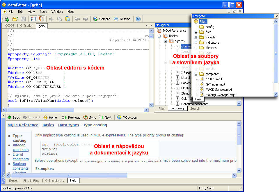 Dále je zde v záložce Dictionary referenční dokumentace jazyka MQL4 (tuto záložku budete využívat častěji), která je významově kategorizovaná dle příslušných oblastí. V součinnosti s nápovědou lze pak poklepáním zobrazit význam a funkčnost jednotlivých příkazů.
