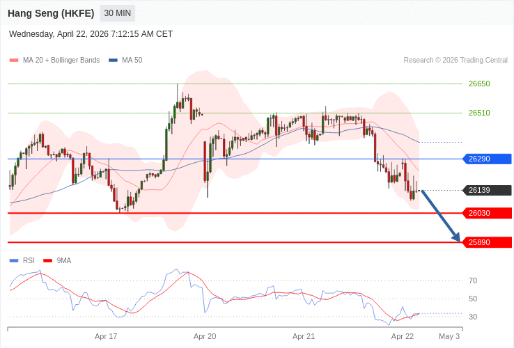 Klíčová slova: Intradenní výhled | Indikátor | Pozice | RSI | Rezistence | Short | Trading | Hang Seng | Pivot | Trading Central | Supporty a rezistence | Výhled | Krátké (short) pozice | Pokles | Medvědi | Indikátor RSI | Další pokles | Růst | Supporty |