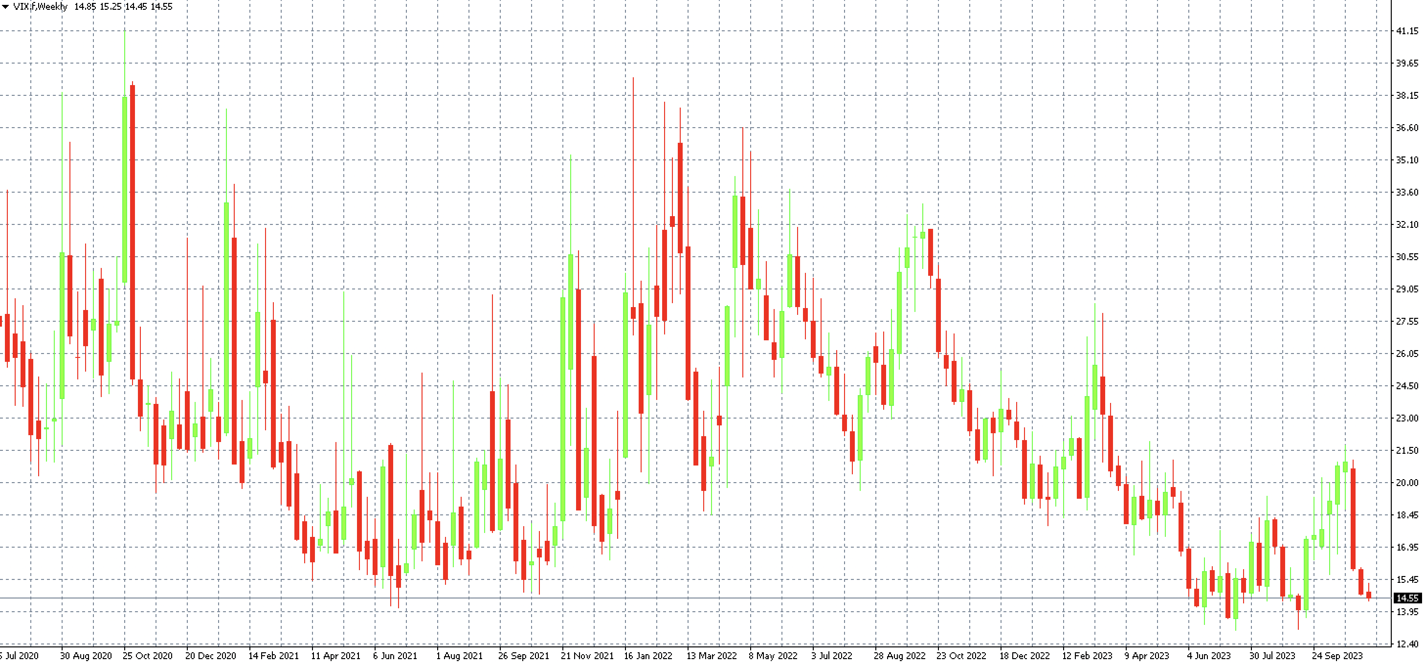 Graf č. 1: VIX.f na týdenním grafu obchodní platformy MT4 od Purple Trading
