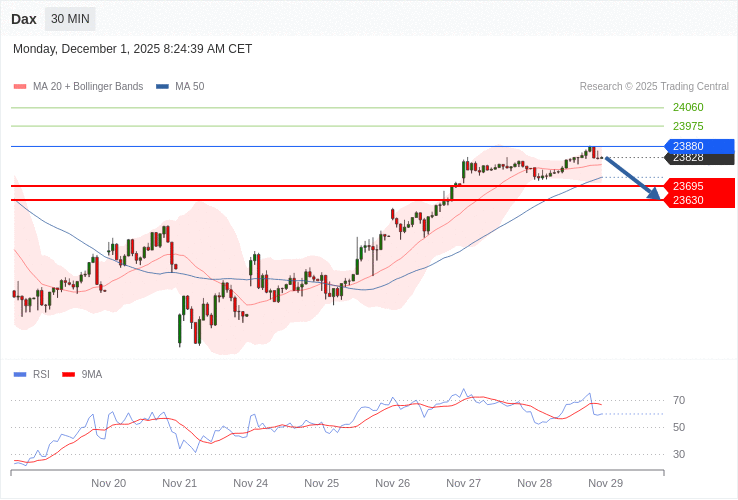 Komentář: Akciový index DAX se nyní nachází poblíž rezistence 23 880.