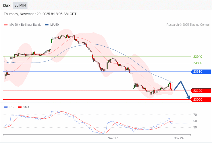 Komentář: Dokud se index DAX bude obchodovat pod rezistencí 23 610, tak je pravděpodobný pohyb do strany s mírnou medvědí tendencí.