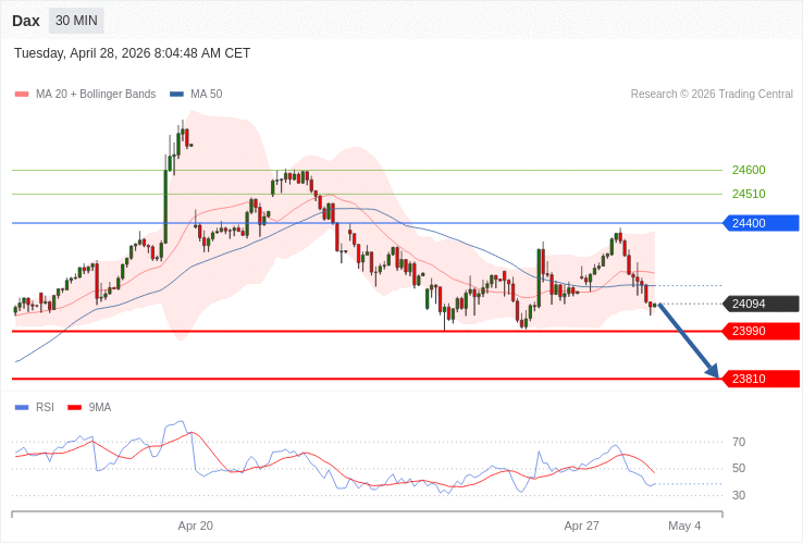 Komentář: Dokud se index DAX bude obchodovat pod rezistencí 24 400, tak je pravděpodobný průraz pod hladinu 23 990.