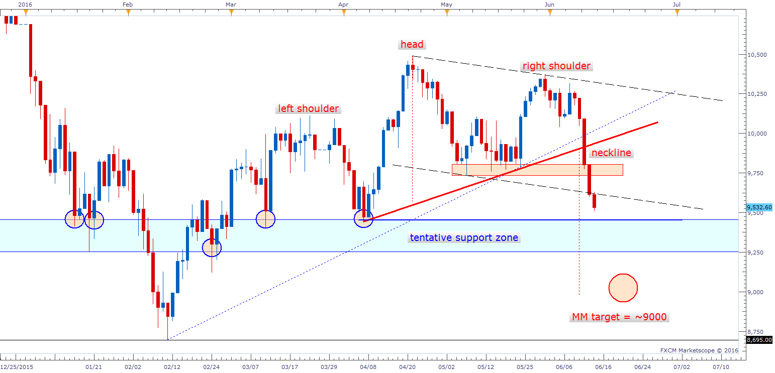 Naopak rezistence leží v oblasti 9 730 - 9 815 a zde by mohlo dojít z krátkodobého hlediska k odrazu (pullback) a k opětovnému poklesu.