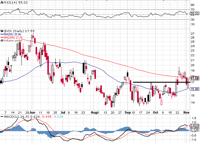 Index volatility VIX (Index strachu) ve středu (první obchodní seance po dvoudenním výpadku) uzavřel na 18,60 a měl nakročeno k vytváření medvědí formace (pro akciový trh). Čtvrtek byl dnem plným optimismu a VIX svým poklesem zpět pod 17 podpořil akciový růst. Jestliže S&P 500 dokončí prolomení rezistence 1430 a VIX půjde zároveň dolů, dostaneme pro akciový trh růstový signál. V pátek k tomu nedošlo a VIX uzavřel nad 17.