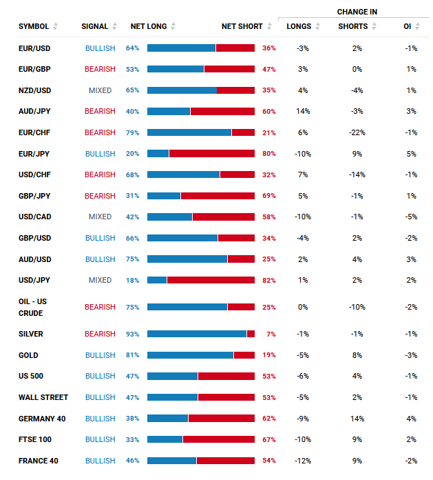 Index spekulativního sentimentu (SSI index) a aktuální otevřené obchodní pozice na FOREXU od retailových traderů.