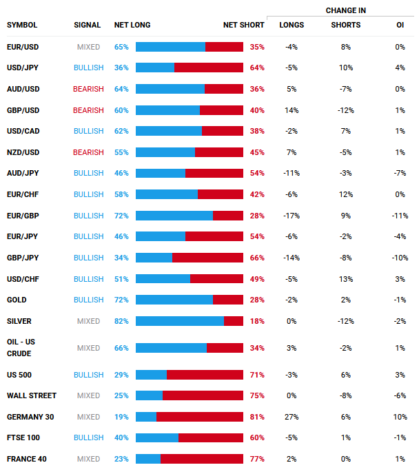 Index spekulativního sentimentu (SSI index) a aktuální otevřené obchodní pozice na FOREXU od retailových traderů.