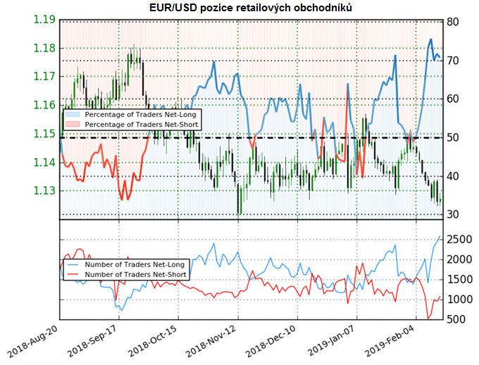 Níže je aktuální vývoj kurzu EUR/USD (svíčkový graf, levá osa) a procentuální poměr traderů, kteří mají otevřené long a short obchodní pozice (modrá a červená křivka, pravá osa) na denní bázi. Níže je pak počet retailových traderů, kteří mají otevřené long a short pozice.