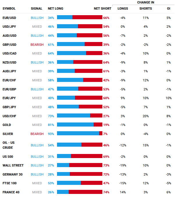 Index spekulativního sentimentu (SSI index) a aktuální otevřené pozice na Forexu. -