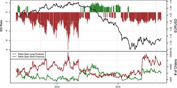 Index spekulativního sentimentu (SSI index) a aktuální otevřené obchodní pozice na FOREXU od retailových traderů. Podrobný popis tohoto indikátoru najdete zde. -
