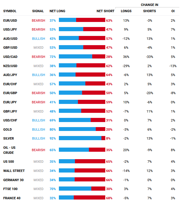 Index spekulativního sentimentu (SSI index) a aktuální otevřené pozice na Forexu. -