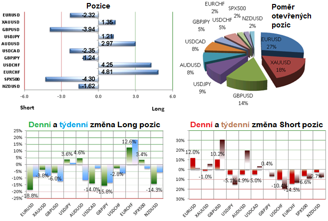 Index spekulativního sentimentu (SSI index) a aktuální otevřené pozice na Forexu. -