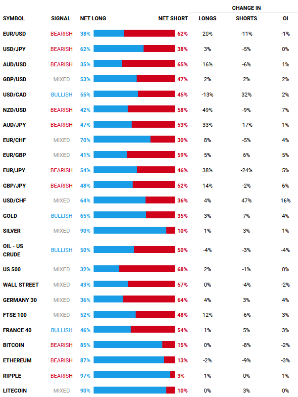 Index spekulativního sentimentu (SSI index) a aktuální otevřené obchodní pozice na FOREXU od retailových traderů.