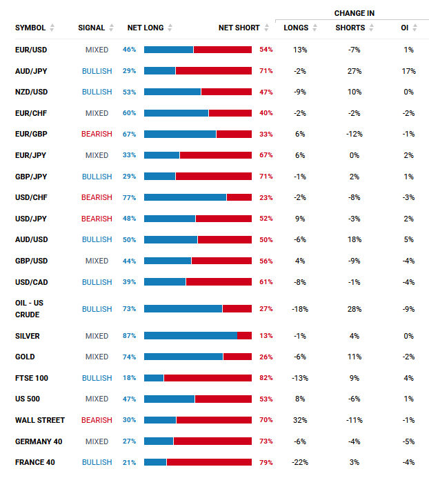 Index spekulativního sentimentu (SSI index) a aktuální otevřené obchodní pozice na FOREXU od retailových traderů.