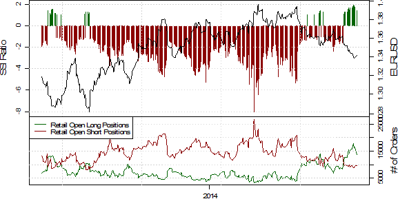 Index spekulativního sentimentu (SSI index) a aktuální otevřené obchodní pozice na FOREXU od retailových traderů. Podrobný popis tohoto indikátoru najdete zde. -