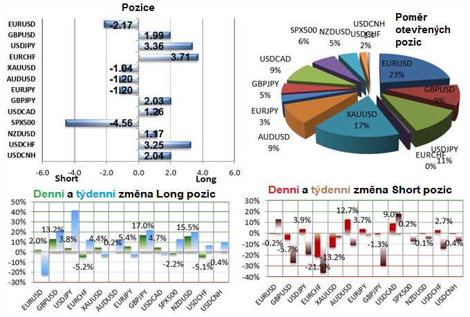 Index spekulativního sentimentu (SSI index) a aktuální otevřené pozice na Forexu. -