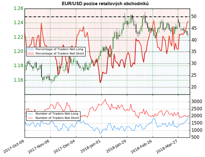 Níže je aktuální vývoj kurzu EUR/USD (svíčkový graf, levá osa) a procentuální poměr traderů, kteří mají otevřené long a short obchodní pozice (modrá a červená křivka, pravá osa) na denní bázi. Níže je pak počet retailových traderů, kteří mají otevřené long a short pozice.