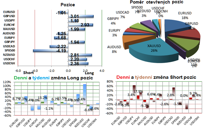Index spekulativního sentimentu (SSI index) a aktuální otevřené pozice na Forexu. -