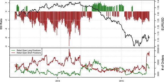 Index spekulativního sentimentu (SSI index) a aktuální otevřené obchodní pozice na FOREXU od retailových traderů. Podrobný popis tohoto indikátoru najdete zde. -