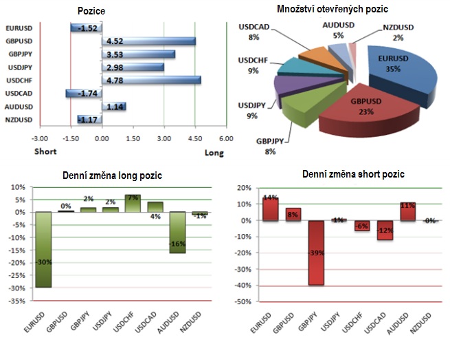 Index spekulativního sentimentu (SSI index - FXCM) a aktuální otevřené pozice na Forexu. -