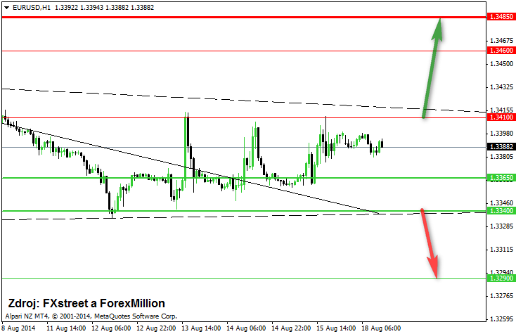 Měnový pár EUR/USD se pohybuje bez výraznějšího intradenního trendu. Pokud by dokázal překonat rezistenci 1,3410, znamenalo by to zahájení rostoucího trendu a možnost dosažení další úrovně rezistence 1,3460 – 1,3485. Opačným případem by bylo, kdyby měnový pár EUR/USD dokázal překonat úroveň supportu 1,3340. Poté bychom mohli očekávat pokles až na 1,3290.