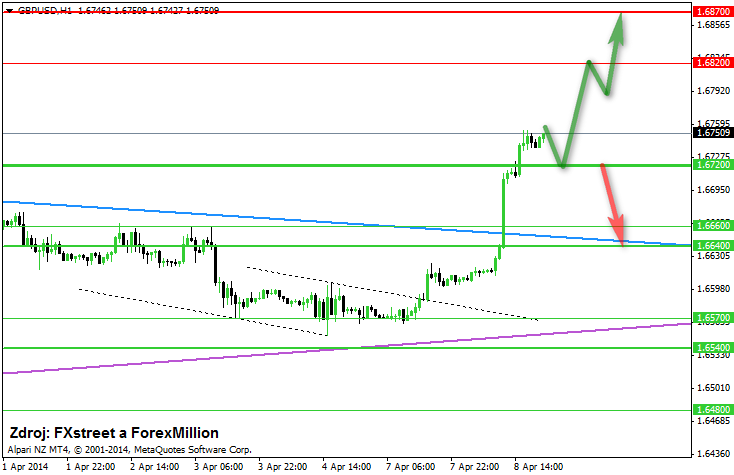 Dokud se měnový pár GBP/USD bude obchodovat nad supportem 1,6720, potom zůstane v intradenním rostoucím trendu a bude zřejmě posilovat směrem k rezistenci 1,6820 a potom k 1,6870.