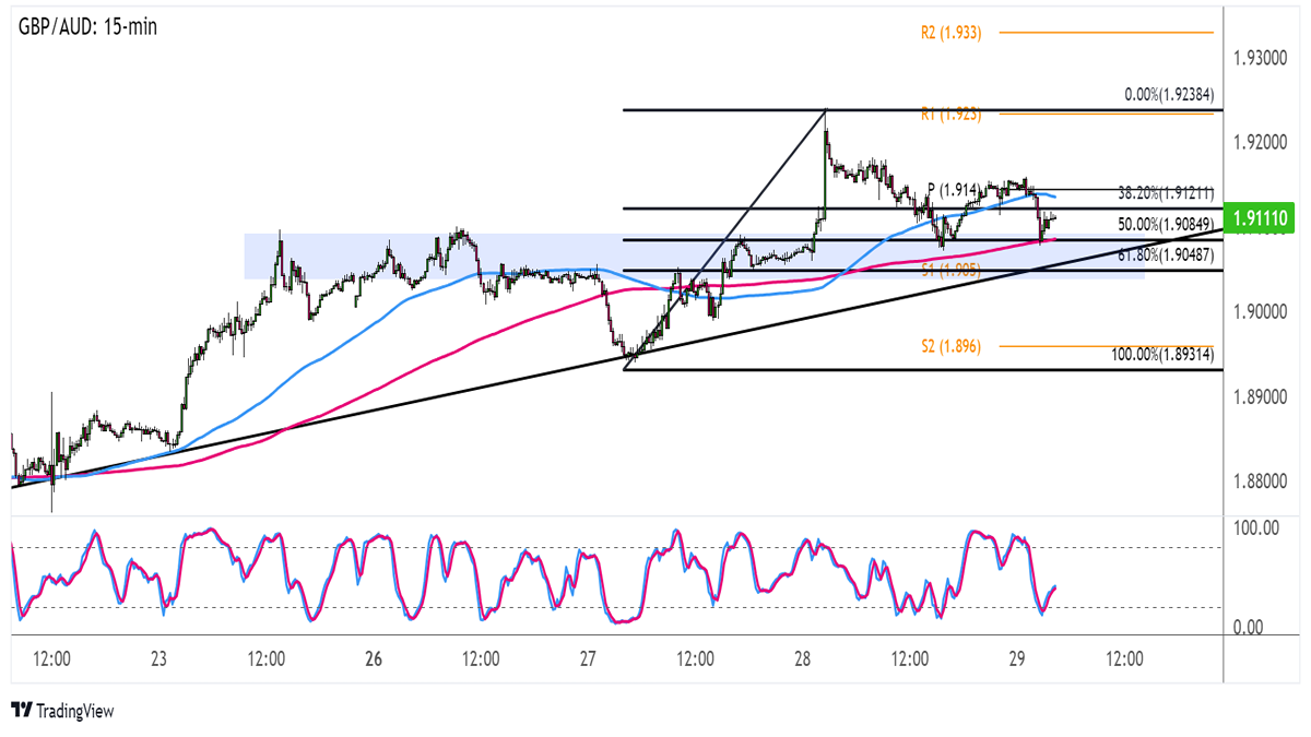 Měnový pár GBP/AUD se na 15minutovém grafu odráží od již dříve prolomené oblasti rezistence (throwback - nyní support), která koresponduje s úrovní 50 % Fibonacciho retracementu a také s klouzavým průměrem SMA 200. Poblíž zmiňovaného supportu se také nachází rostoucí trendová linie. Najdou tak kolem současných úrovní znovu sílu býci a posílíme zpět směrem k předchozím swingovým maximům?