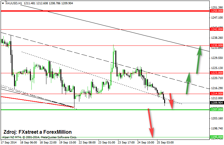 Intradenní rostoucí trend by byl zahájen, pokud by cena zlata stoupla nad úroveň rezistence 1214. Potom bychom očekávali růst směrem k rezistenci 1223.