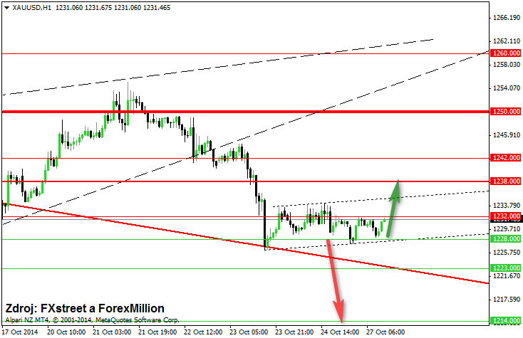 Případný intradenní klesající trend by mohl být zahájen, pokud by cena zlata klesla pod úroveň supportu 1228. Potom bychom očekávali pokles směrem k supportu 1223, případně až k 1214.