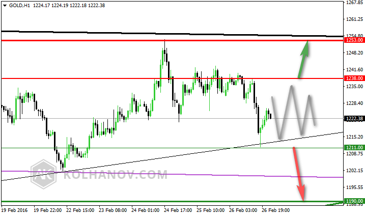 Cena zlata (XAU/USD, GOLD) se obchoduje v intradenním pásmu mezi supportem 1211 a rezistencí 1238. Za signál zahájení intradenního klesajícího trendu budeme považovat překonání supportu 1211, pokles pak zřejmě bude pokračovat směrem k hladině 1190.