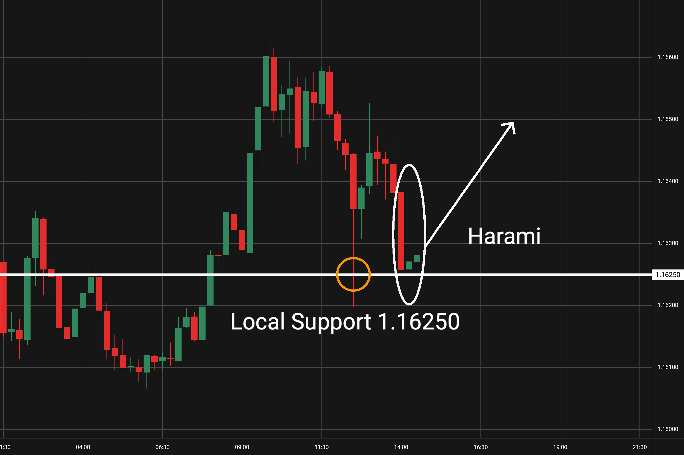 EUR/USD: Tento měnový pár je na 15minutovém grafu v klesajícím trendu několik hodin. Vytvořila se formace Harami na lokálním supportu. Cena je tak připravena na růst a mohli bychom uvažovat o long pozici. Blížící se fundamentální zprávy by neměly ovlivnit vývoj tohoto měnového páru.