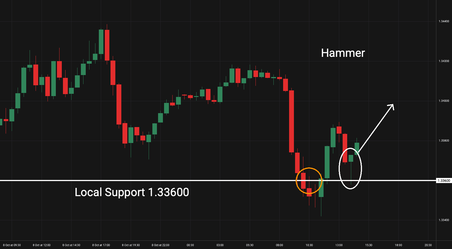 EUR/USD: Tento měnový pár je na 30minutovém grafu v klesajícím trendu několik hodin. Vytvořila se formace kladivo (Hammer) na lokálním supportu. Cena je tak připravena na růst a mohli bychom uvažovat o long pozici. Blížící se fundamentální zprávy by neměly ovlivnit vývoj tohoto měnového páru. -
