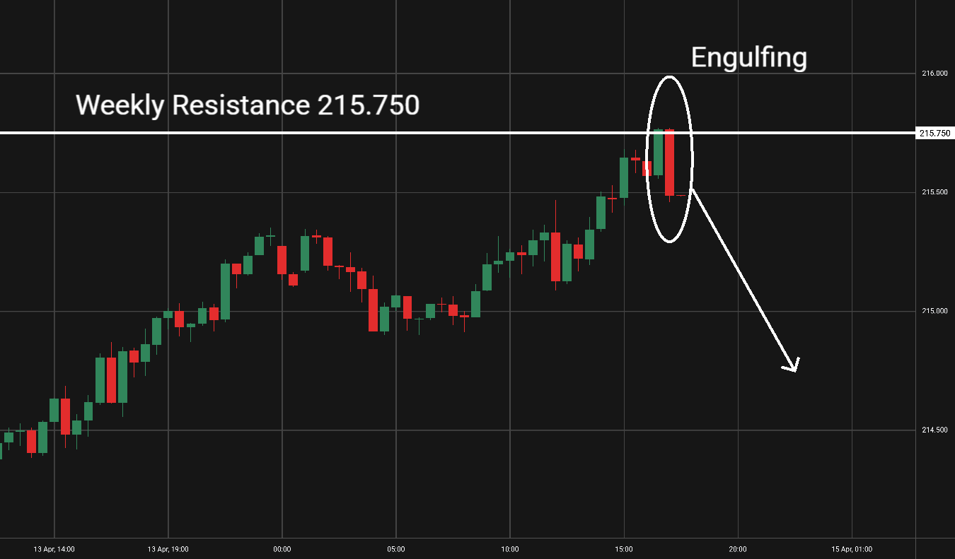 GBP/JPY: Tento měnový pár je na 30minutovém grafu v rostoucím trendu několik hodin. Vytvořila se formace medvědí pohlcení (Engulfing) na týdenní rezistenci. Cena je tak připravena na pokles a mohli bychom uvažovat o short pozici. Blížící se fundamentální zprávy by neměly ovlivnit vývoj tohoto měnového páru.