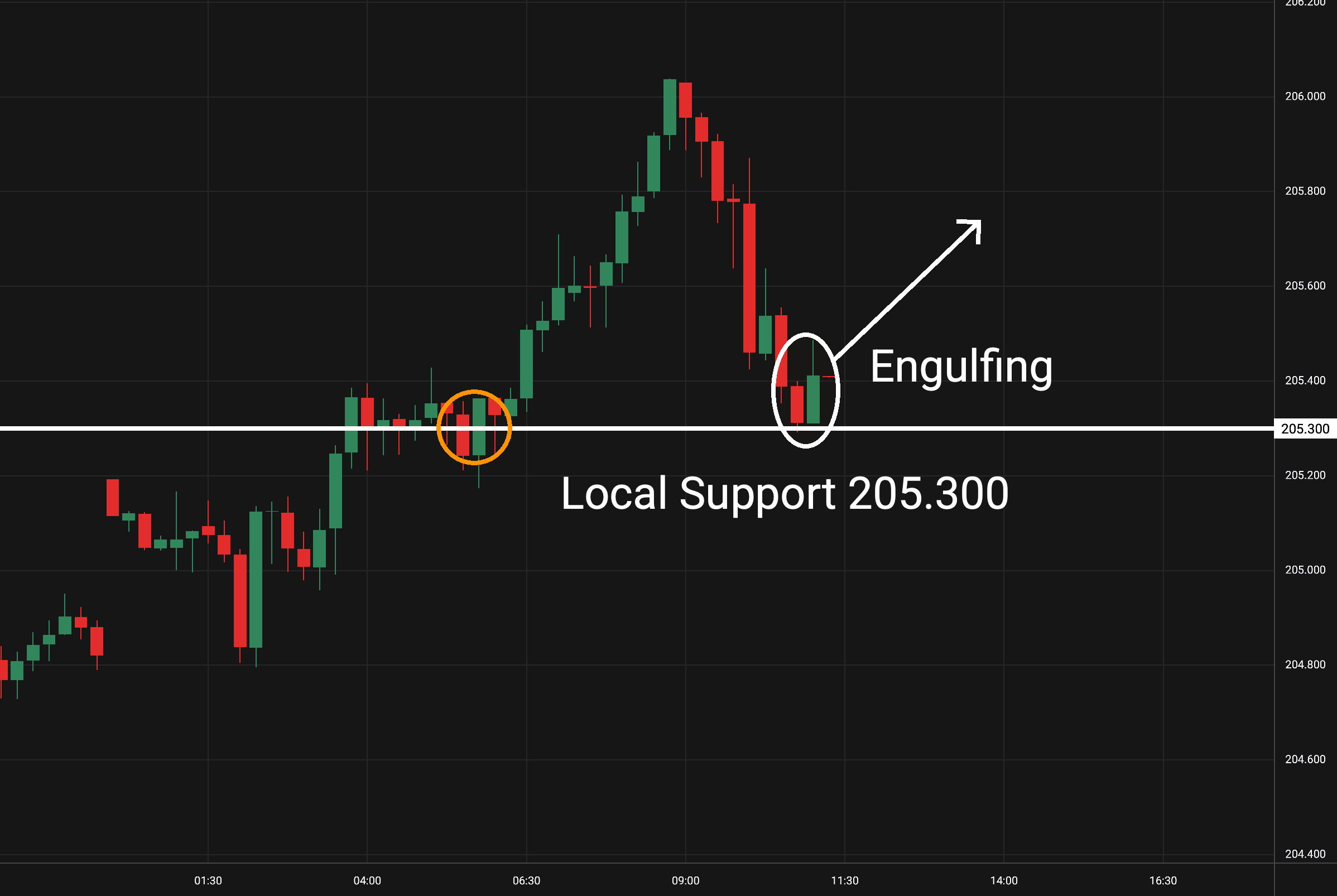 GBP/JPY: Tento měnový pár je na 30minutovém grafu v rostoucím trendu několik hodin. Vytvořila se formace býčí pohlcení (Engulfing) na lokálním supportu. Cena je připravena na růst a mohli bychom uvažovat o long pozici. Blížící se fundamentální zprávy by neměly ovlivnit vývoj tohoto měnového páru. -
