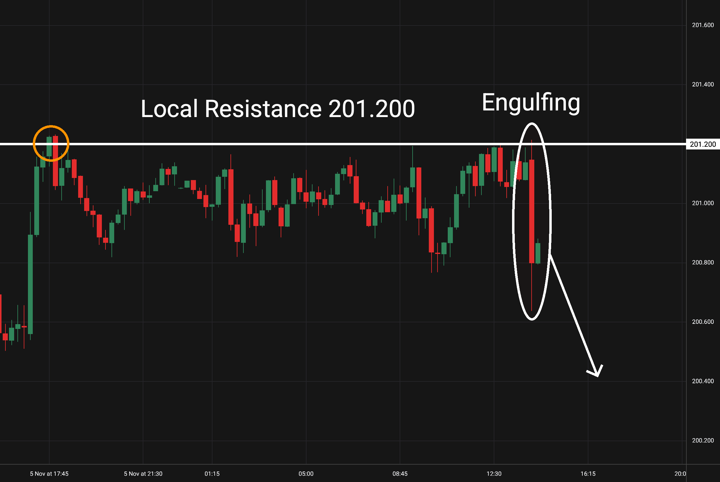 GBP/JPY: Tento měnový pár je na 15minutovém grafu v rostoucím trendu několik hodin. Vytvořila se formace medvědí pohlcení (Engulfing) na lokální rezistenci. Cena je připravena na pokles a mohli bychom uvažovat o short pozici. Blížící se fundamentální zprávy by neměly ovlivnit vývoj tohoto měnového páru. -