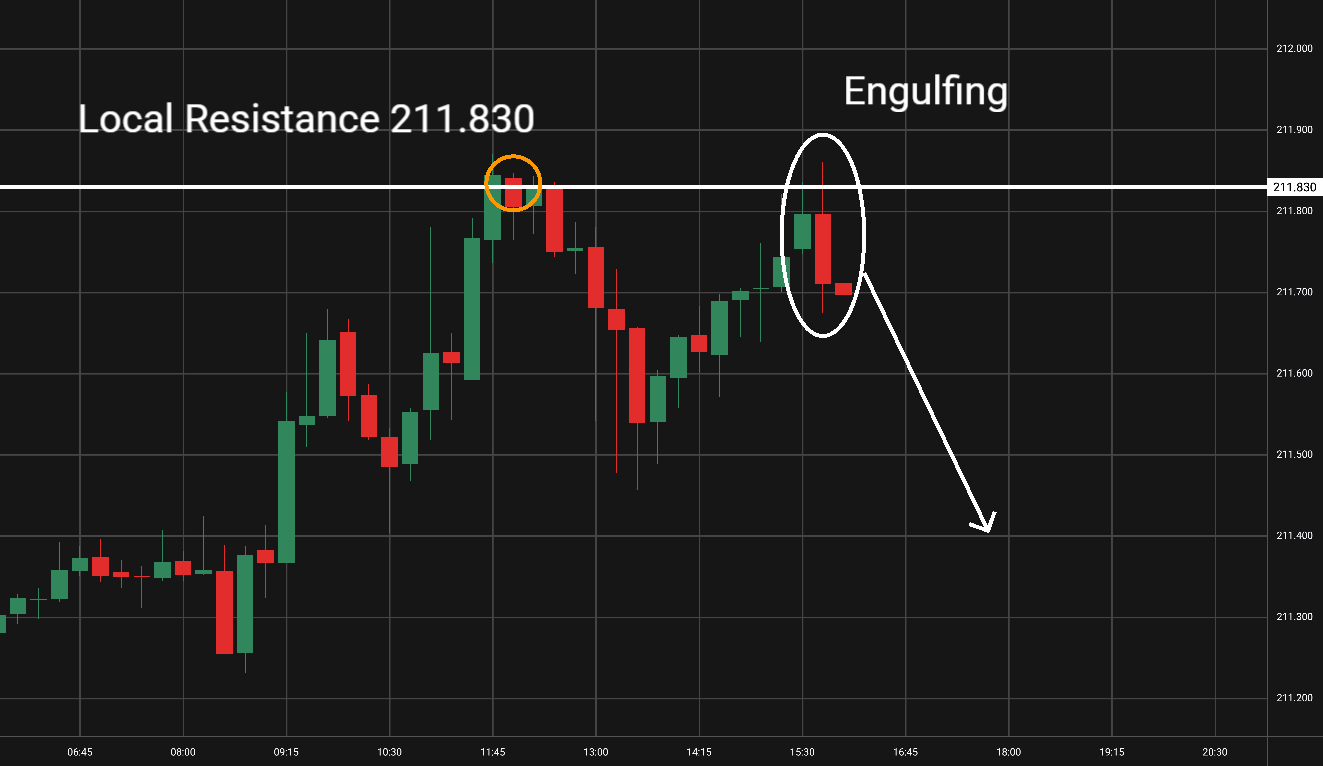 GBP/JPY: Tento měnový pár je na 30minutovém grafu v rostoucím trendu několik hodin. Vytvořila se formace medvědí pohlcení (Engulfing) na lokální rezistenci. Cena je připravena na pokles a mohli bychom uvažovat o short pozici. Blížící se fundamentální zprávy by neměly ovlivnit vývoj tohoto měnového páru. -