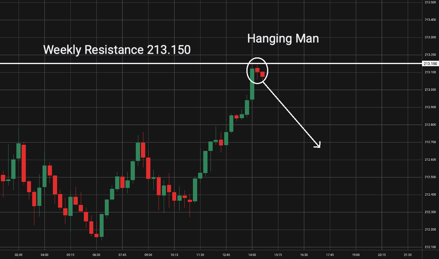 GBP/JPY: Tento měnový pár je na 15minutovém grafu v rostoucím trendu několik hodin. Vytvořila se formace oběšenec (Hanging Man) na týdenní rezistenci. Cena je tak připravena na pokles a mohli bychom uvažovat o short pozici. Blížící se fundamentální zprávy by neměly ovlivnit vývoj tohoto měnového páru.