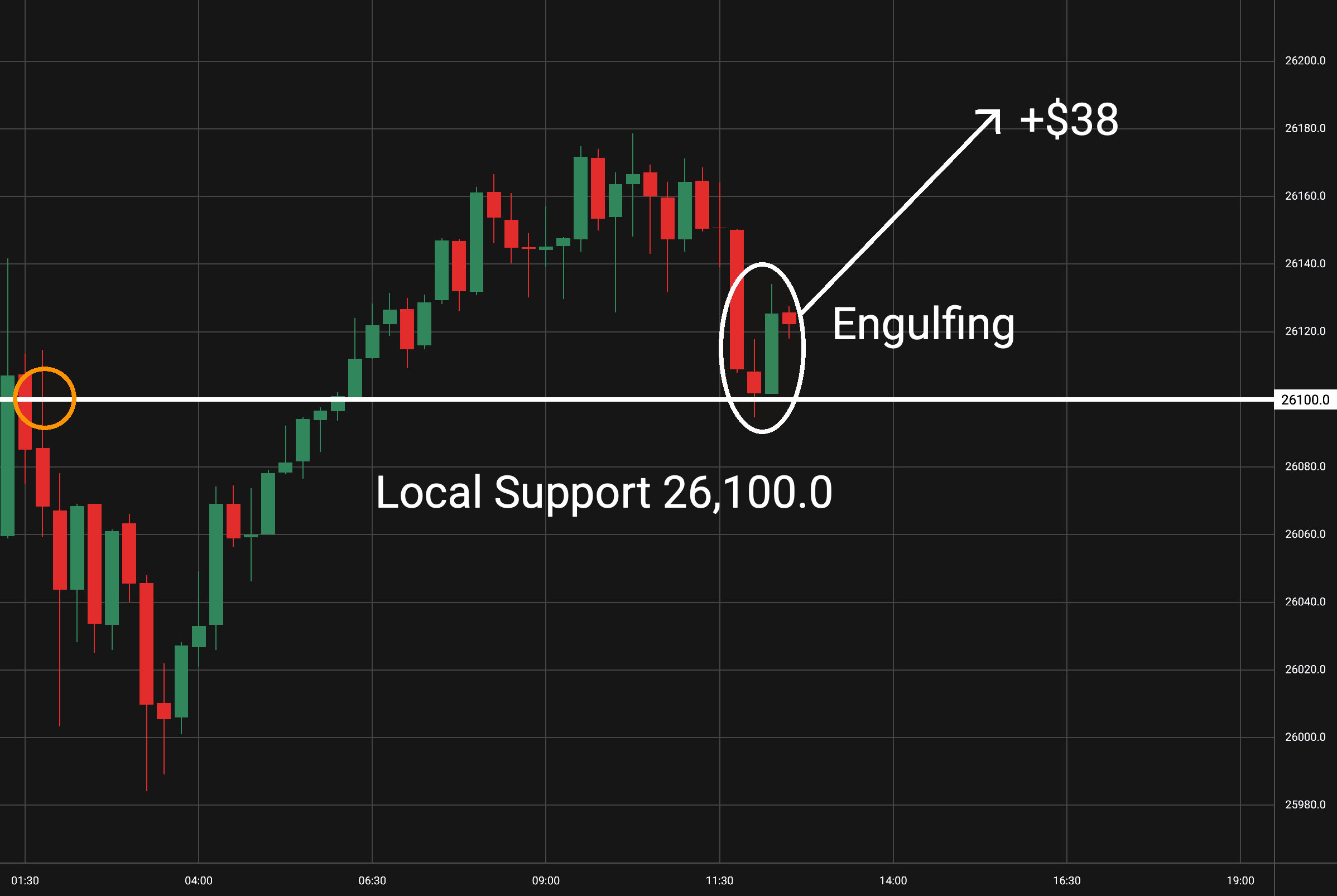 Nasdaq: Tento akciový index je na 15minutovém grafu v klesajícím trendu několik hodin. Vytvořila se formace býčí pohlcení (Engulfing) na lokálním supportu. Cena je tak připravena na růst a mohli bychom uvažovat o long pozici. Blížící se fundamentální zprávy by neměly ovlivnit vývoj tohoto trhu.
