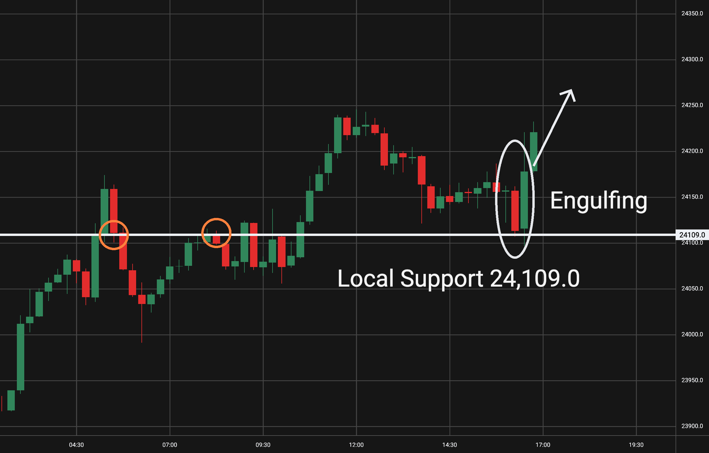 Nasdaq: Tento akciový index je na 15minutovém grafu v klesajícím trendu několik hodin. Vytvořila se formace býčí pohlcení (Engulfing) na lokálním supportu. Cena je tak připravena na růst a mohli bychom uvažovat o long pozici. Blížící se fundamentální zprávy (PMI v USA) by mohly ovlivnit vývoj tohoto trhu.