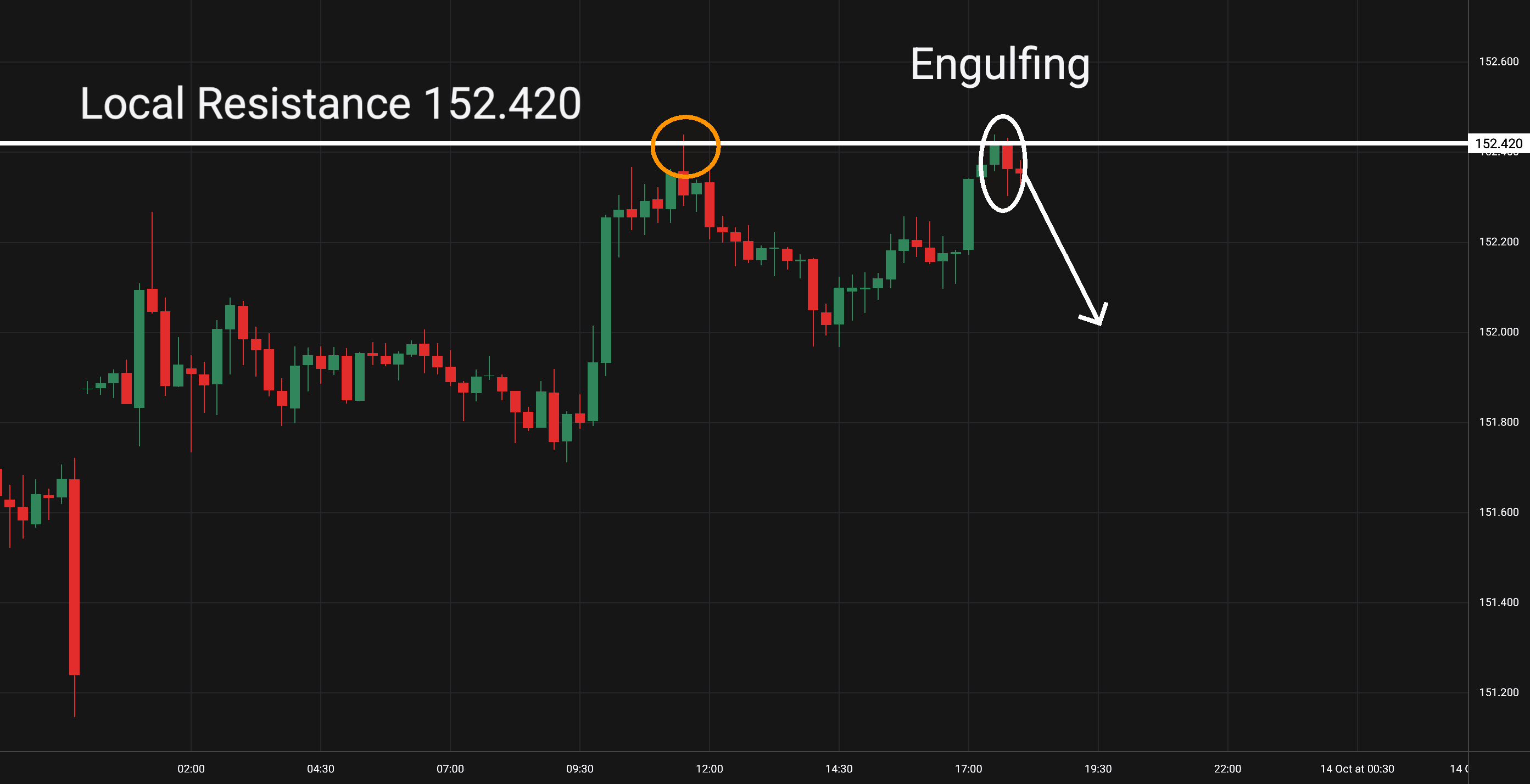 USD/JPY: Tento měnový pár se na 15minutovém grafu dostal k rezistenci 150,65 a nyní se vytvořila formace medvědí pohlcení (Engulfing). -
