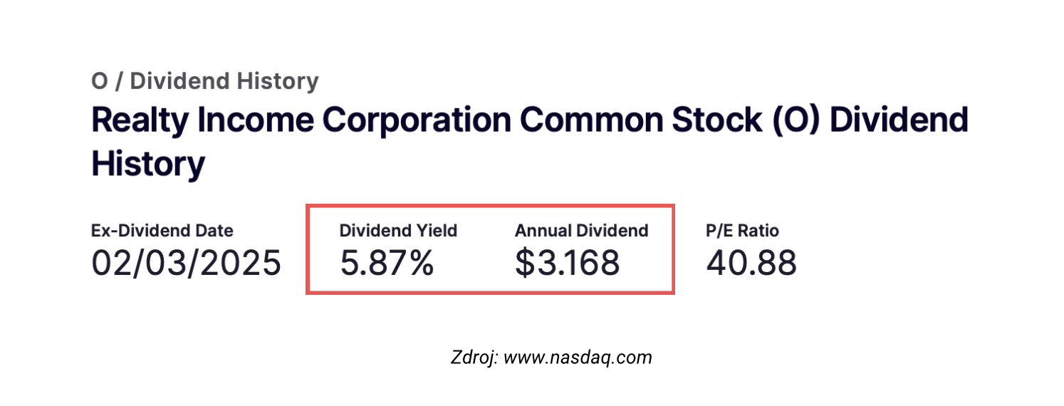 Příklad: Na obrázku vidíme printscreen ze stránek americké elektronické burzy Nasdaq, roční výše dividendy společnosti Realty Income je 3,168 dolarů, vůči současné tržní ceně akcie vychází roční dividendový výnos na 5,87 %.
