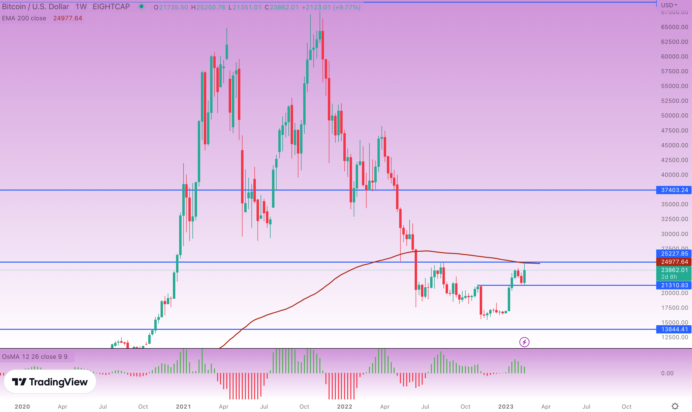 Bitcoin sa tiež pekne odrazil od EMA200 na 4-hodinovom časovom rámci, pričom divergencia potvrdila ďalší možný posun vyššie. Malý pokles na 23 000 $ alebo dokonca 22 000 $ je možný, ale napriek tomu má Bitcoin tendenciu prelomiť úroveň 25 000 $ podľa všetkých býčích faktorov.