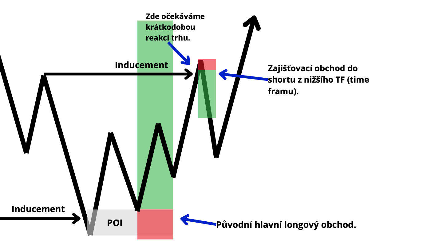 Představme si například situaci, kdy jsme v souladu s vyšším časovým rámcem otevřeli nákupní pozici na order blocku nebo POI, tedy obchodujeme od inducementu směrem nahoru. Na nižším časovém rámci však vidíme, že cena vytváří inducement od vytvořeného high, tedy očekáváme pohyb směrem dolů a je velmi pravděpodobné, že dojde k vybrání stop-lossů pod lokální strukturou (pod určitými vytvořenými lows). V takovém případě může otevření menší prodejní pozice fungovat jako krátkodobý hedge. Pokud se cena skutečně pohne proti našemu původnímu dlouhodobému obchodu, ztráta na této hlavní long pozici se zmírní díky zisku z hedge (z shortové pozice). A pokud cena okamžitě pokračuje ve směru našeho hlavního plánu, hedge zavřeme s malou ztrátou, která je vyvážena ziskovým potenciálem hlavní pozice. Konkrétně se na tento příklad můžeme níže podívat graficky.