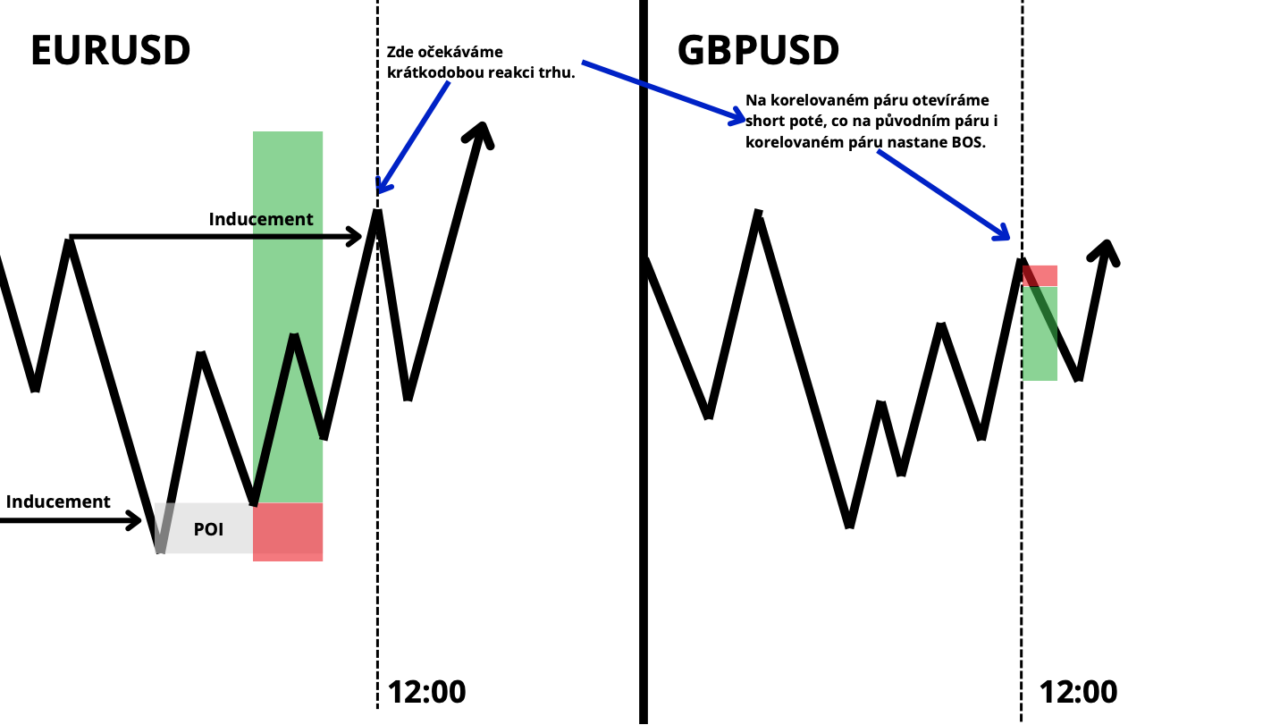 Na trhu se ukazuje jasná příležitost k longu na EUR/USD díky hodinovému inducementu, ale zároveň vidíme, že v průběhu toho, co je obchod na EUR/USD otevřený, tak míří do významného inducementu, kdy očekáváme krátkodobý opačný pohyb. Obchodník tak nechá otevřený long na EUR/USD a zároveň otevře menší short na GBP/USD. Oba páry jsou silně korelované neboli pohybují se velmi podobně. Pokud dolar náhle posílí a EUR/USD začne klesat, část ztráty se pokryje ziskem z GBP/USD. Pokud naopak euro získá na síle (nebo dolar oslabí), zisk z hlavní pozice na EUR/USD převýší menší ztrátu na shortu GBP/USD.