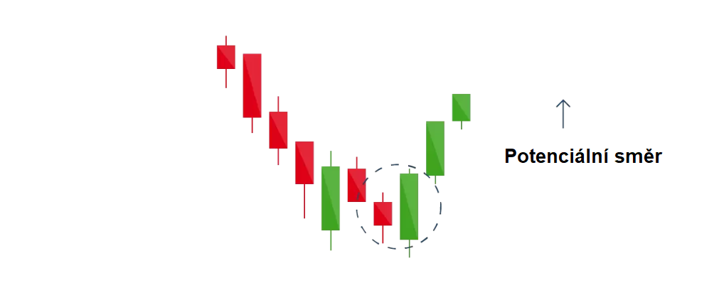 První svíčka ukazuje, že trh ovládali prodejci. Přestože druhá svíčka otevírá níže než první, nový býčí impulz tlačí cenu vzhůru - často do té míry, že druhá svíčka je dvakrát větší než ta předchozí.