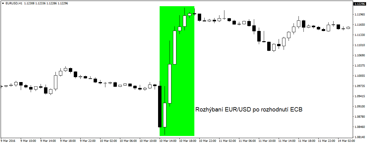 Obr. 1 – Rozhýbání EUR/USD v roce 2016 po vyhlášení ECB -> snížení úrokové sazby z 0.05% na 0.00%