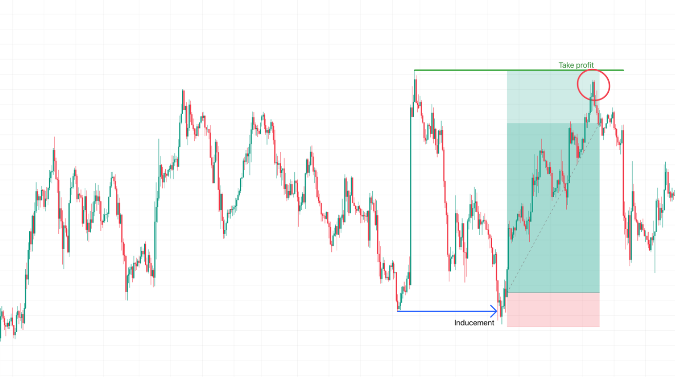 V této ukázce je dobře vidět typický scénář, kdy obchod vypadá jako „hotový“, ale Take-Profit se nakonec nevyplní. Po sweepu dolní likvidity (inducementu) se trh prudce otočí nahoru, vytvoří trendový pohyb a dojde až do oblasti předchozích maxim, kde logicky leží čekající prodejní likvidita a zároveň i Take-Profity longů. Problém je, že trh se často nechová tak, že by disciplinovaně „dotkl“ přesně na úroveň našeho TP, vyplnil ji a teprve potom se otočil. Naopak často se otočka spustí už o pár pipů dříve, protože velcí účastníci začnou v cílové zóně agresivně prodávat ještě před tím, než se vyplní celá masa čekajících limitů na přesné úrovni high, a tím pádem se cena k našemu TP ani nedostane.