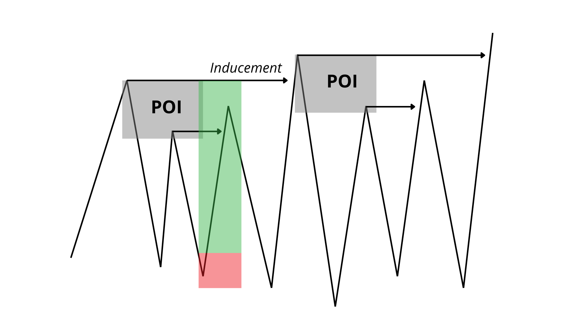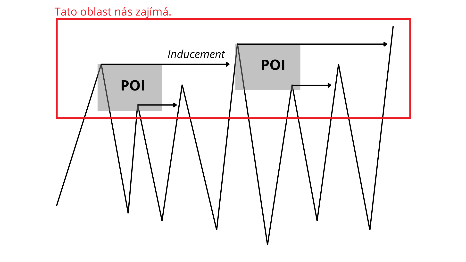 Zde vidíme, že cena na první pokus nedosáhne nad horní high nad POI (oblast nad šedými obdélníky), ale až po několika pokusech. Jedná se v jednoduchosti o skladbu a logiku inducementů. To, co nás v tomto případě zajímá je postupné mitigování a výběry jednotlivých vrcholů. Vidíme, že první jsme si vyznačili POI, následně přišla mitigace, následně přijde výběr daného high v samotné mitigaci (druhý inducement v POI) a následuje znova pohyb dolů, až konečný třetí pohyb je celkový inducement nad dané POI. Pokud bychom tento koncept měli porovnat s tím, kde byl náš předchozí obchod, tak by to bylo s největší pravděpodobností na tomto místě.