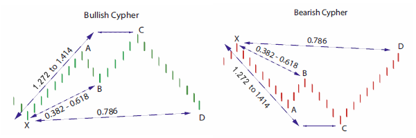 Formace Cypher je opět pětibodovou strukturou, podobně jako tomu bylo v případě gartleyho či netopýří formace. Svým tvarem připomíná tato struktura psací „M“ či obráceně „W“. Pozorné čtenáře musí na první pohled zaujmout, že bod C bude poprvé z dosud představených formací ležet nad či pod bodem A, což výrazně zvyšuje obchodovatelnost formace z bodu C, kde jde de facto o falešný průraz k bodu A, viz obrázek.