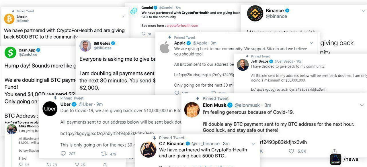 Dané tweety mali rôzne znenie. Niektoré hovorili o Giveaway súťaži o 5 000 BTC. Iné klasicky pýtali 1 000 dolárov v BTC s tým, že naspäť pošlú 2 000 dolárov. Ďalšie sa zamerali na „charitatívnu“ pomoc obetiam COVID-19. Všetky tieto tweety však mali rovnakú BTC adresu, na ktorú mal byť Bitcoin poslaný. Išlo o klasický a veľmi jednoducho čitateľný hack a podvod.