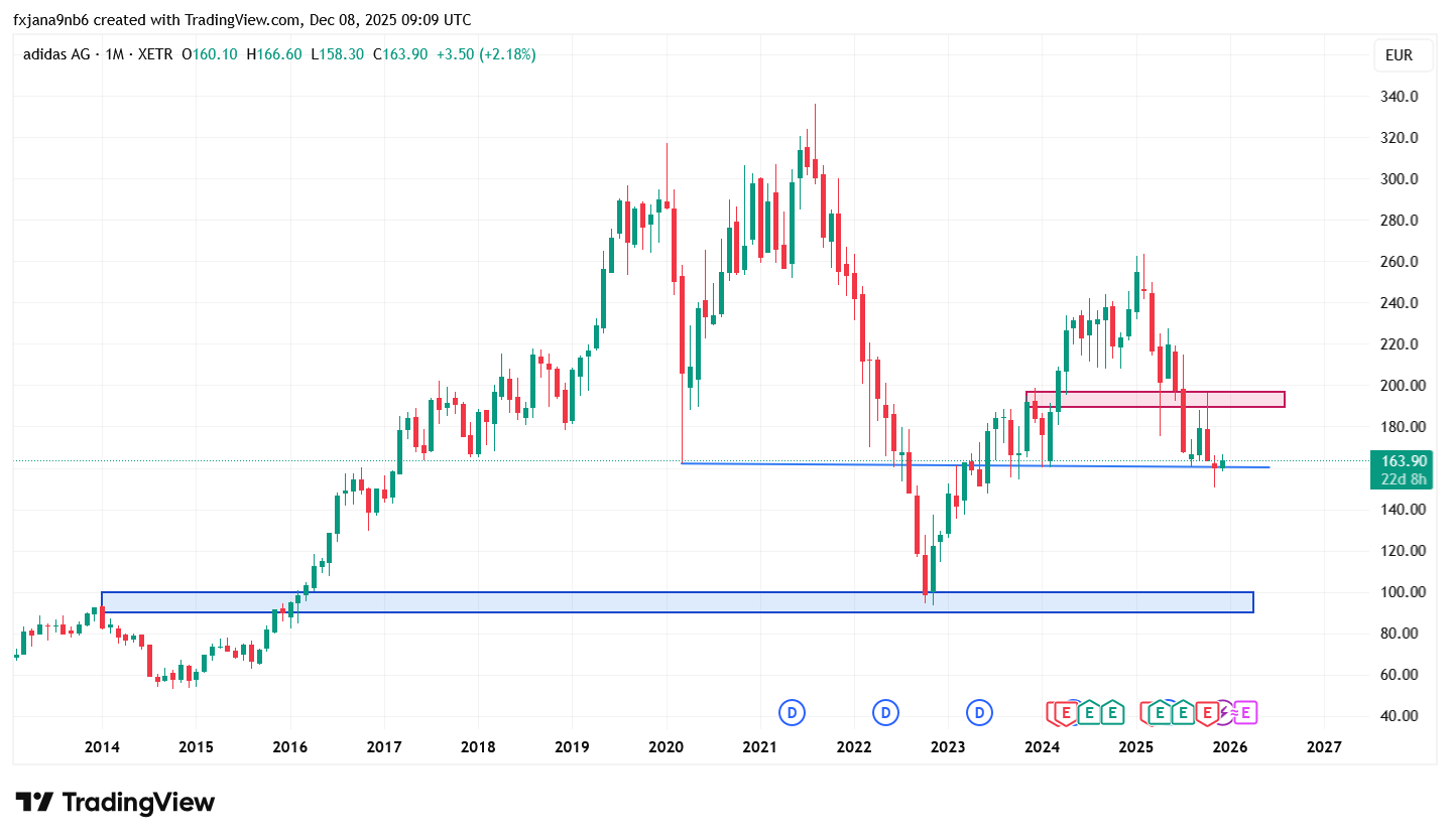 Vývoj ceny akcií firmy Adidas na měsíčním grafu (MN):